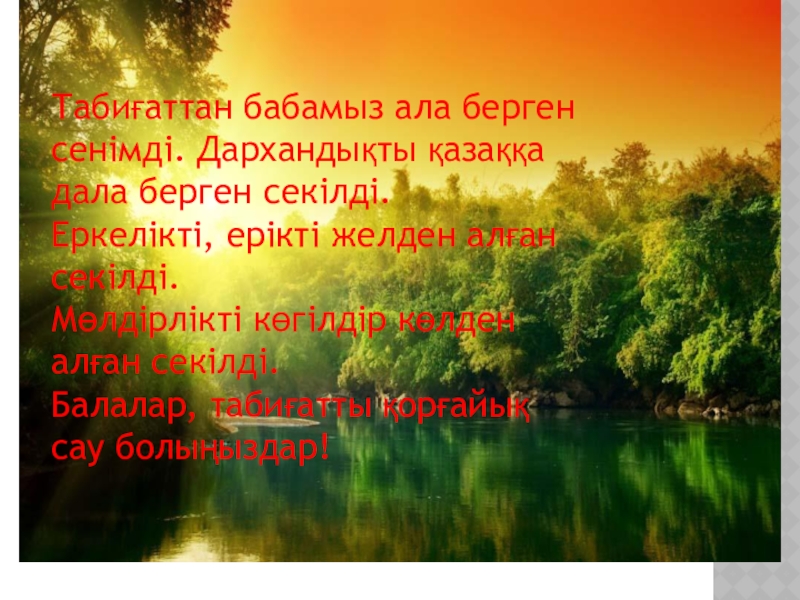желден алған секілді. Мөлдірлікті көгілдір көлден алған секілді. Балалар, табиғатты қорғайық сау болыңыздар!