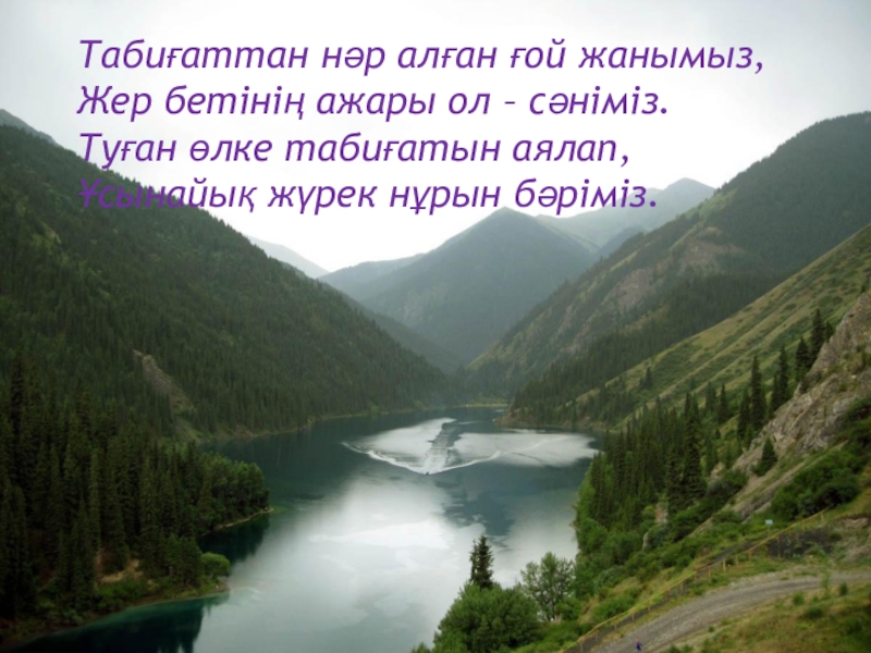Табиғаттан нәр алған ғой жанымыз, Жер бетінің ажары ол – сәніміз. Туған өлке табиғатын аялап, Ұсынайық жүрек