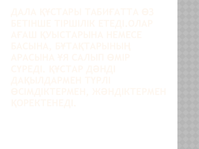 Слайд 26Дала құстары табиғатта өз бетінше тіршілік етеді.Олар ағаш қуыстарына немесе басына,