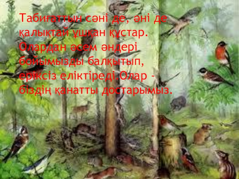 Слайд 37Табиғаттын сәні де, әні де қалықтай ұшқан құстар. Олардан әсем әндері