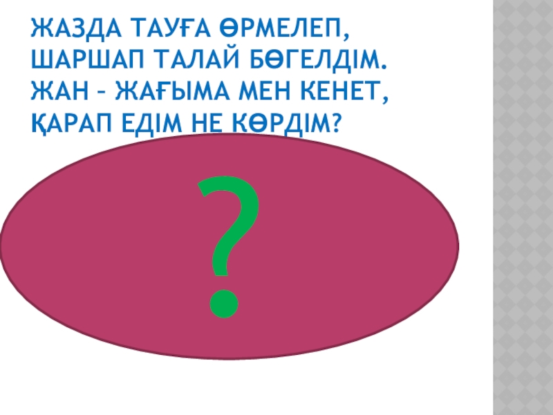 Слайд 6Жазда тауға өрмелеп, шаршап талай бөгелдім. Жан – жағыма мен кенет, қарап