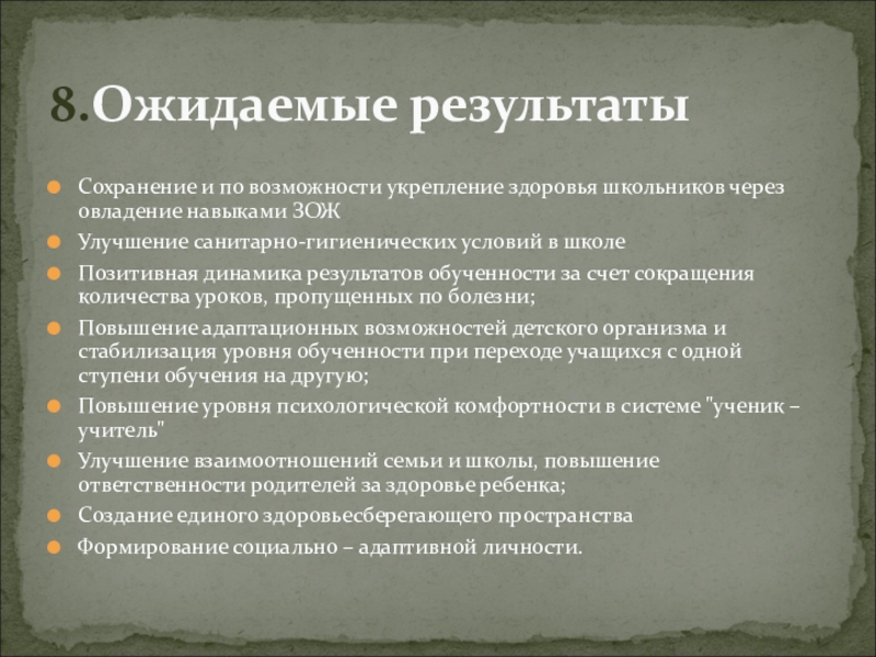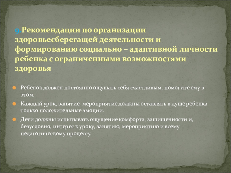 9.Рекомендации по организации здоровьесберегащей деятельности и формированию социально – адаптивной личности ребенка с ограниченными возможностями здоровья