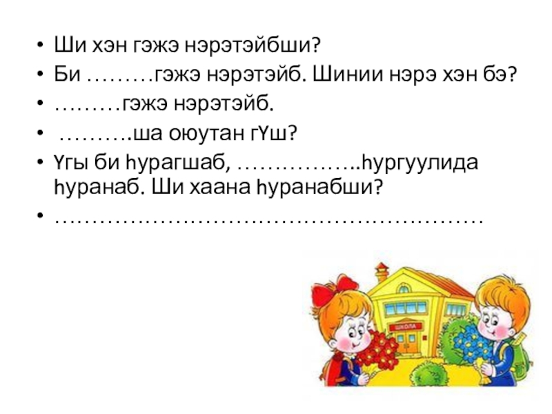 Ши хэн гэжэ нэрэтэйбши?Би ………гэжэ нэрэтэйб. Шинии нэрэ хэн бэ?………гэжэ нэрэтэйб. ……….ша оюутан гYш?Yгы би hурагшаб, ……………..hургуулида