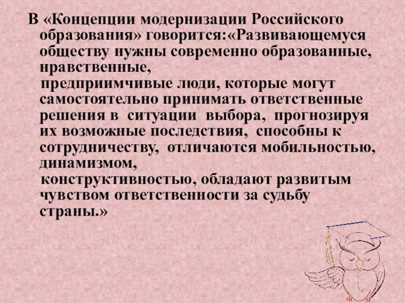 Слайд 4 В «Концепции модернизации Российского образования» говорится:«Развивающемуся обществу нужны современно образованные,