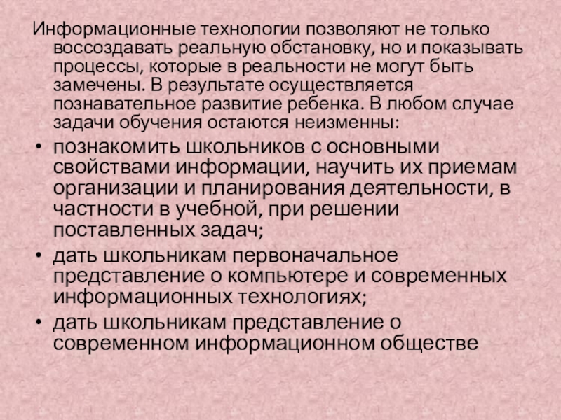 процессы, которые в реальности не могут быть замечены. В результате осуществляется познавательное развитие ребенка. В любом случае задачи обучения остаются неизменны: