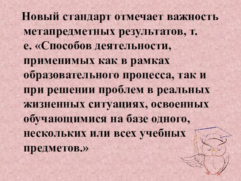 Слайд 6 Новый стандарт отмечает важность метапредметных результатов, т.е. «Способов деятельности, применимых