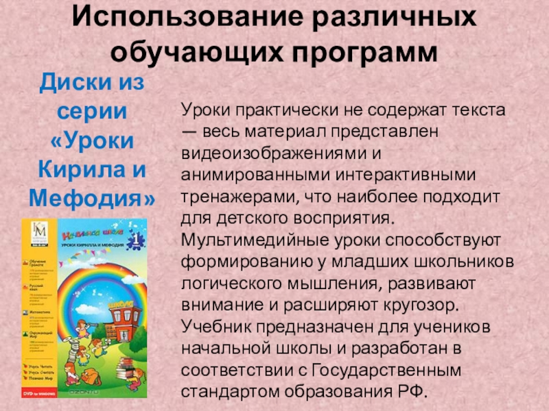 представлен видеоизображениями и анимированными интерактивными тренажерами, что наиболее подходит для детского восприятия. Мультимедийные уроки способствуют формированию у младших школьников логического мышления, развивают внимание и расширяют кругозор.