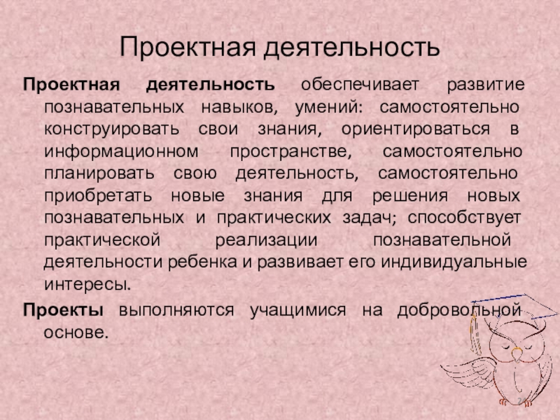 Проектная деятельность обеспечивает развитие познавательных навыков, умений: самостоятельно конструировать свои