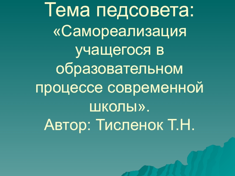 Слайд 1Тема педсовета: «Самореализация учащегося в образовательном процессе современной школы». Автор: Тисленок Т.Н.