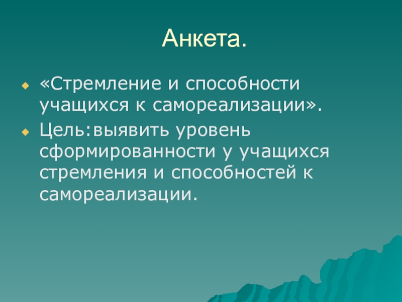 Анкета.«Стремление и способности учащихся к самореализации».Цель:выявить уровень сформированности у учащихся стремления и способностей к самореализации.