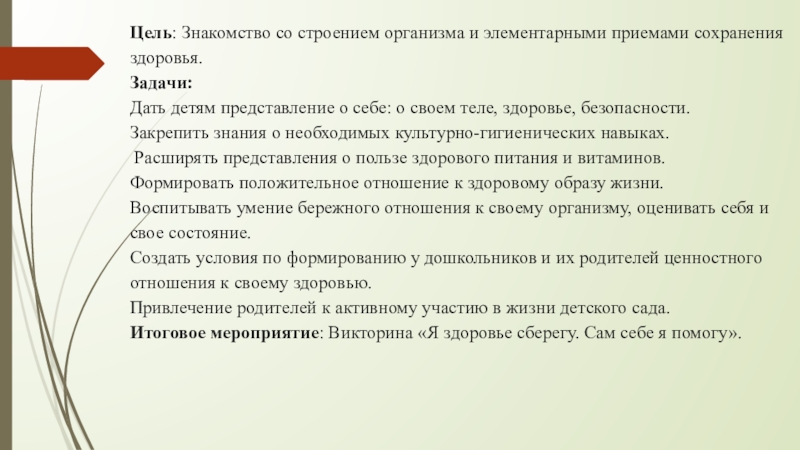 Слайд 3Цель: Знакомство со строением организма и элементарными приемами сохранения здоровья.