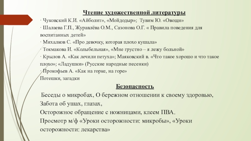 · Чуковский К.И. «Айболит», «Мойдодыр»; Тувим Ю. «Овощи»