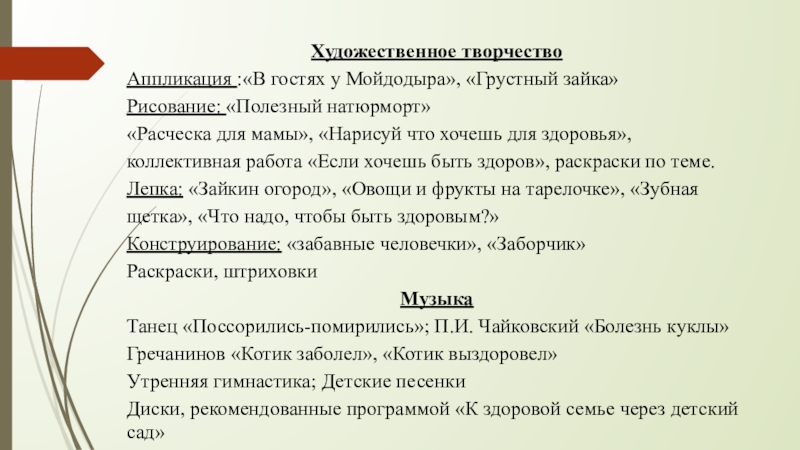 · Крылов А. «Как лечили петуха»; Маяковский в. «Что такое хорошо и что такое плохо»; «Ладушки» (Русские народные песенки)