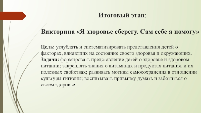 Итоговое мероприятие: Викторина «Я здоровье сберегу. Сам себе я помогу».