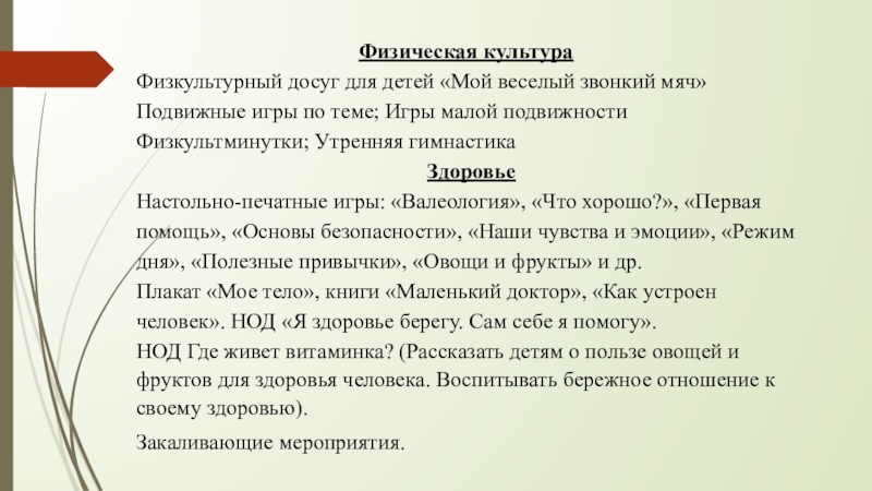 Настольно-печатные игры: «Валеология», «Что хорошо?», «Первая помощь», «Основы безопасности», «Наши чувства и эмоции», «Режим дня», «Полезные привычки», «Овощи и фрукты» и др.