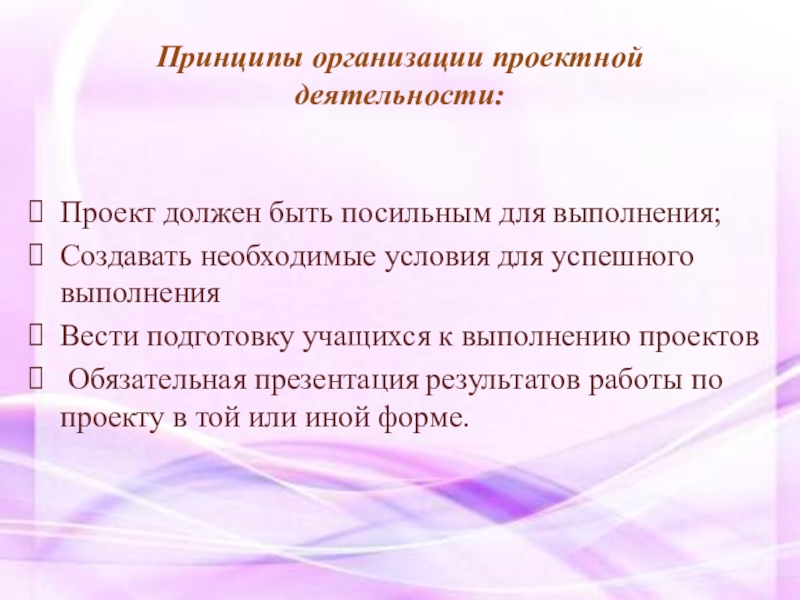 Принципы организации проектной деятельности:Проект должен быть посильным для выполнения; Создавать необходимые условия для успешного выполнения Вести подготовку