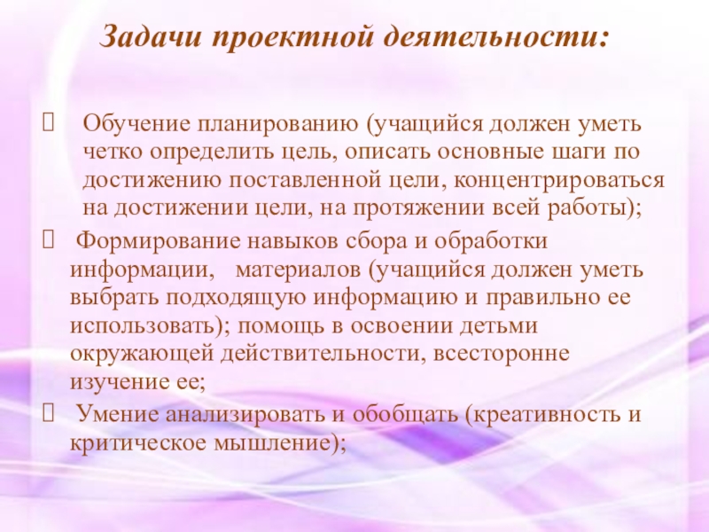 Задачи проектной деятельности:Обучение планированию (учащийся должен уметь четко определить цель, описать основные шаги по достижению поставленной цели,