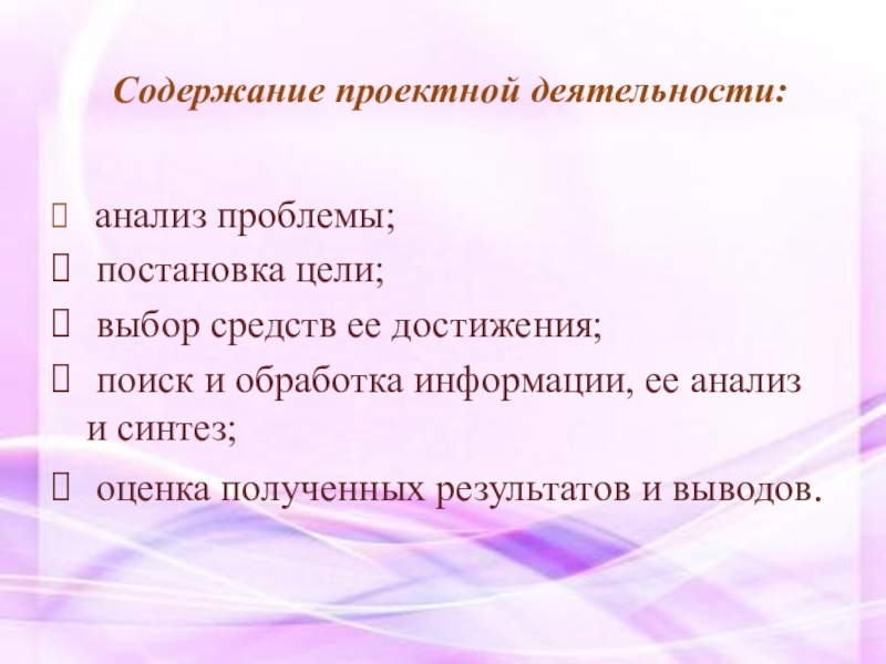 Содержание проектной деятельности: анализ проблемы; постановка цели; выбор средств ее достижения; поиск и обработка информации, ее