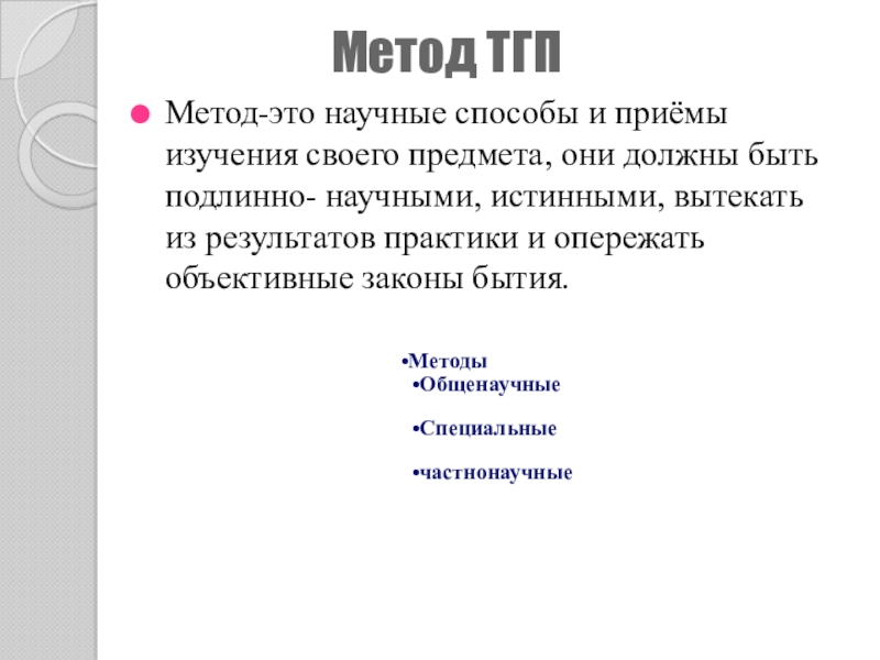 Метод-это научные способы и приёмы изучения своего предмета, они должны быть подлинно- научными, истинными, вытекать из результатов практики и опережать объективные законы бытия.