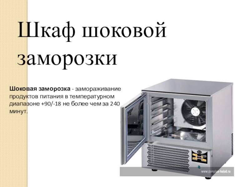 Шкаф шоковой заморозкиШоковая заморозка - замораживание продуктов питания в температурном диапазоне +90/-18 не более чем за 240 минут.