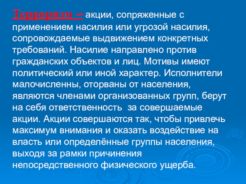 Слайд 10Терроризм – акции, сопряженные с применением насилия или угрозой насилия, сопровождаемые