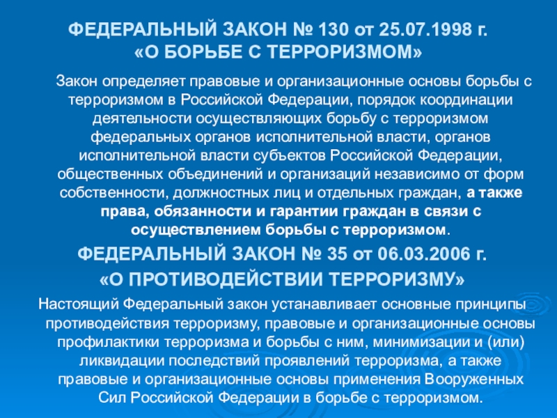 Настоящий Федеральный закон устанавливает основные принципы противодействия терроризму, правовые и организационные основы профилактики терроризма и борьбы с ним, минимизации и (или) ликвидации последствий проявлений терроризма, а также правовые и организационные основы применения Вооруженных Сил Российской Федерации в борьбе с терроризмом.