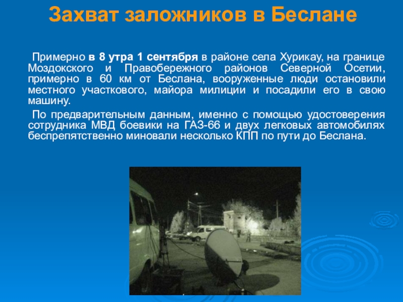 села Хурикау, на границе Моздокского и Правобережного районов Северной Осетии, примерно в 60 км от Беслана, вооруженные люди остановили местного участкового, майора милиции и посадили его в свою машину.
