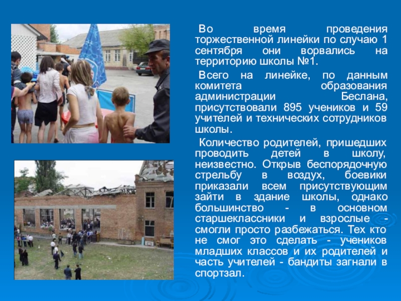 Количество родителей, пришедших проводить детей в школу, неизвестно. Открыв беспорядочную стрельбу в воздух, боевики приказали всем присутствующим зайти в здание школы, однако большинство - в основном старшеклассники и взрослые - смогли просто разбежаться. Тех кто не смог это сделать - учеников младших классов и их родителей и часть учителей - бандиты загнали в спортзал.
