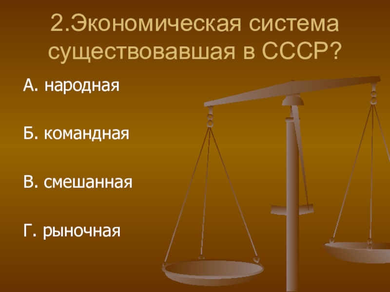 2.Экономическая система существовавшая в СССР?А. народнаяБ. команднаяВ. смешаннаяГ. рыночная