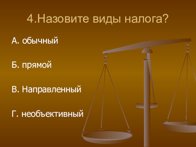 4.Назовите виды налога?А. обычный Б. прямойВ. НаправленныйГ. необъективный