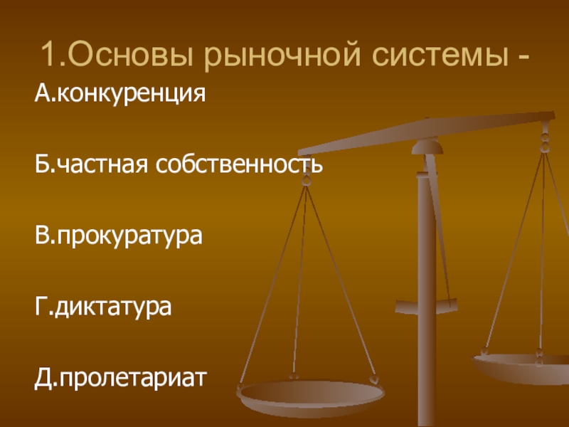 1.Основы рыночной системы -А.конкуренцияБ.частная собственностьВ.прокуратураГ.диктатураД.пролетариат