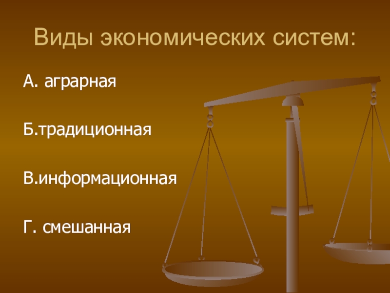Виды экономических систем:А. аграрнаяБ.традиционнаяВ.информационнаяГ. смешанная