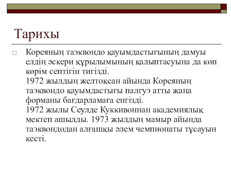 ТарихыКореяның таэквондо қауымдастығының дамуы елдің әскери құрылымының қалыптасуына да көп көрім септігін тигізді. 1972 жылдың желтоқсан айында