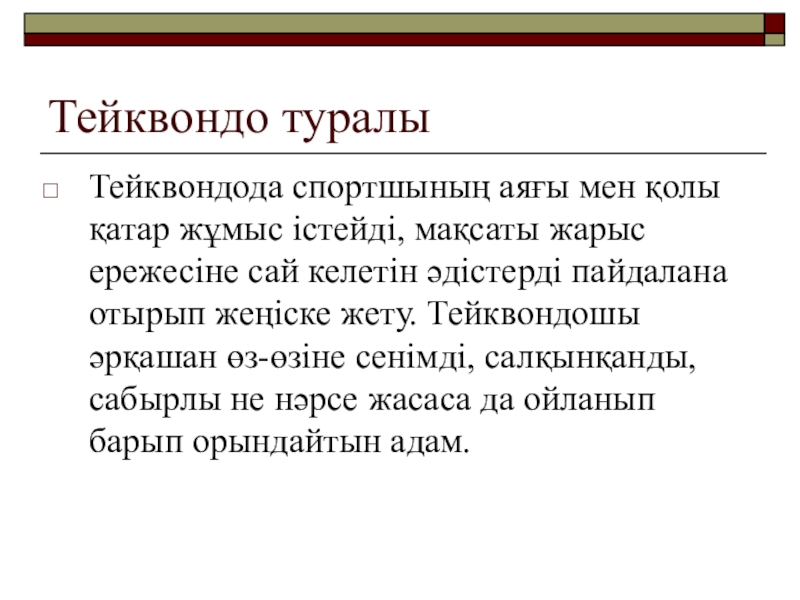 Тейквондо туралыТейквондода спортшының аяғы мен қолы қатар жұмыс істейді, мақсаты жарыс ережесіне сай келетін әдістерді пайдалана отырып