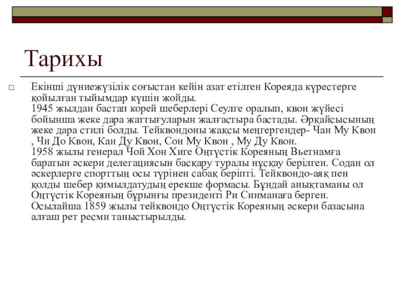 күшін жойды. 1945 жылдан бастап корей шеберлері Сеулге оралып, квон жүйесі бойынша жеке дара жаттығуларын жалғастыра бастады. Әрқайсысының жеке дара стилі болды. Тейквондоны жақсы меңгергендер- Чан Му Квон , Чи До Квон, Кан Ду Квон, Сон Му Квон , Му Ду Квон. 1958 жылы генерал Чой Хон Хиге Оңтүстік Кореяның Вьетнамға баратын әскери делегациясын басқару туралы нұсқау берілген. Содан ол әскерлерге спорттың осы түрінен сабақ беріпті. Тейквондо-аяқ пен қолды шебер қимылдатудың ерекше формасы. Бұндай анықтаманы ол Оңтүстік Кореяның бұрынғы президенті Ри Синманаға берген. Осылайша 1859 жылы тейквондо Оңтүстік Кореяның әскери базасына алғаш рет ресми таныстырылды.