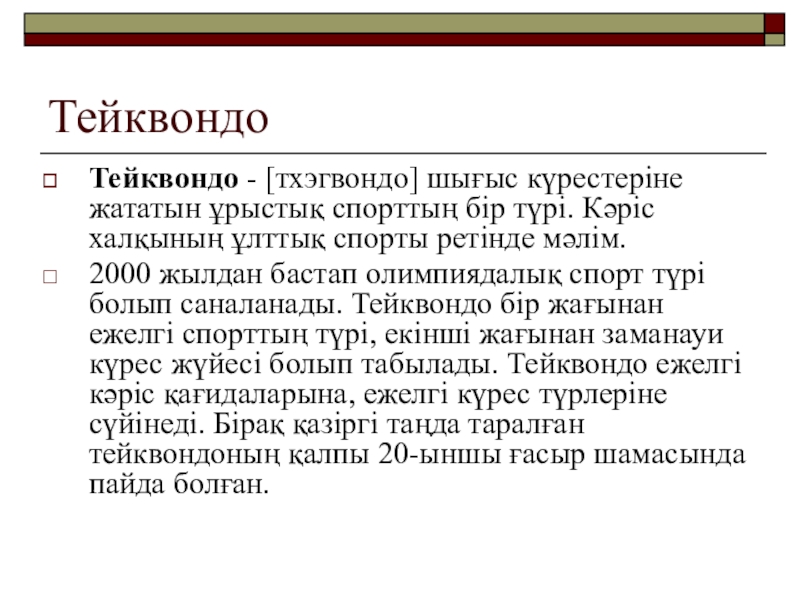 ТейквондоТейквондо - [тхэгвондо] шығыс күрестеріне жататын ұрыстық спорттың бір түрі. Кәріс халқының ұлттық спорты ретінде мәлім.2000 жылдан бастап олимпиядалық спорт түрі болып саналанады. Тейквондо бір жағынан ежелгі спорттың түрі, екінші жағынан заманауи күрес жүйесі болып табылады. Тейквондо