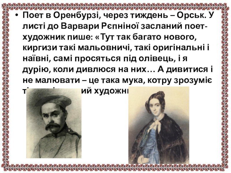Рєпніної засланий поет-художник пише: «Тут так багато нового, киргизи такі мальовничі, такі оригінальні і наївні, самі просяться під олівець, і я дурію, коли дивлюся на них… А дивитися і не малювати – це така мука, котру зрозуміє тільки істинний художник».