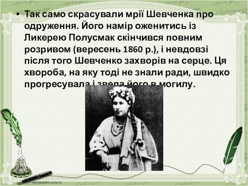 Так само скрасували мрії Шевченка про одруження. Його намір оженитись із