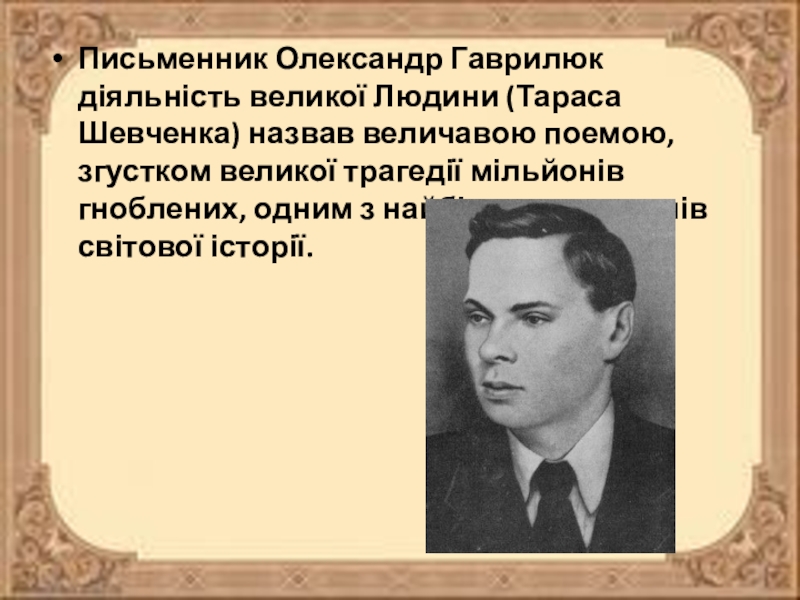 Письменник Олександр Гаврилюк діяльність великої Людини (Тараса Шевченка) назвав величавою поемою,