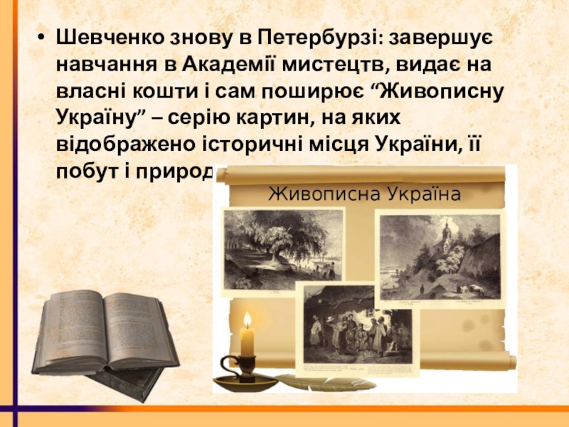 власні кошти і сам поширює “Живописну Україну” – серію картин, на яких відображено історичні місця України, її побут і природу.