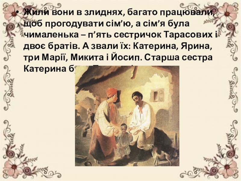 була чималенька – п’ять сестричок Тарасових і двоє братів. А звали їх: Катерина, Ярина, три Марії, Микита і Йосип. Старша сестра Катерина була Тарасові за няню.