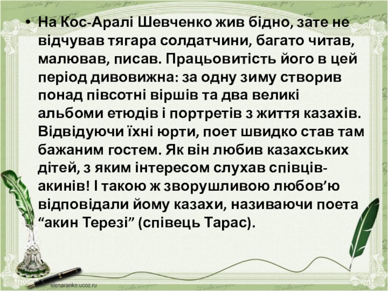читав, малював, писав. Працьовитість його в цей період дивовижна: за одну зиму створив понад півсотні віршів та два великі альбоми етюдів і портретів з життя казахів. Відвідуючи їхні юрти, поет швидко став там бажаним гостем. Як він любив казахських дітей, з яким інтересом слухав співців-акинів! І такою ж зворушливою любов’ю відповідали йому казахи, називаючи поета “акин Терезі” (співець Тарас).