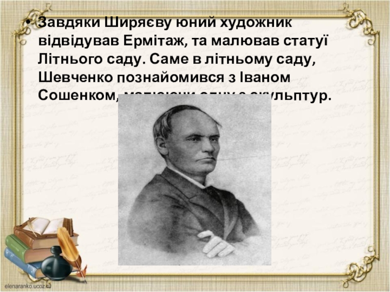 Саме в літньому саду, Шевченко познайомився з Іваном Сошенком, малюючи одну з скульптур.