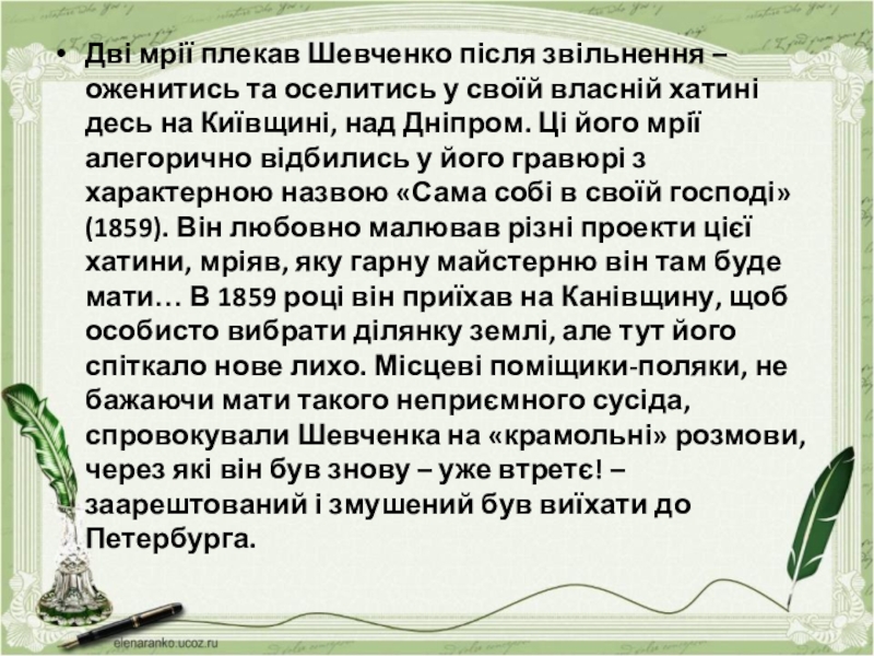 своїй власній хатині десь на Київщині, над Дніпром. Ці його мрії алегорично відбились у його гравюрі з характерною назвою «Сама собі в своїй господі» (1859). Він любовно малював різні проекти цієї хатини, мріяв, яку гарну майстерню він там буде мати… В 1859 році він приїхав на Канівщину, щоб особисто вибрати ділянку землі, але тут його спіткало нове лихо. Місцеві поміщики-поляки, не бажаючи мати такого неприємного сусіда, спровокували Шевченка на «крамольні» розмови, через які він був знову – уже втретє! – заарештований і змушений був виїхати до Петербурга.