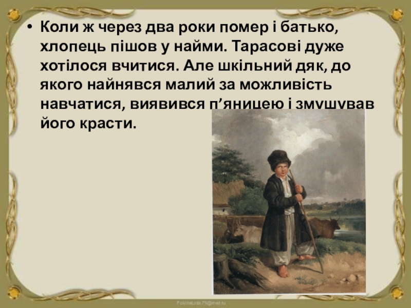 найми. Тарасові дуже хотілося вчитися. Але шкільний дяк, до якого найнявся малий за можливість навчатися, виявився п’яницею і змушував його красти.