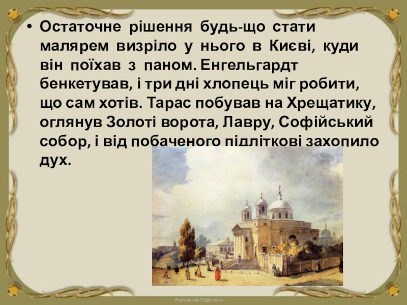 він поїхав з паном. Енгельгардт бенкетував, і три дні хлопець міг робити, що сам хотів. Тарас побував на Хрещатику, оглянув Золоті ворота, Лавру, Софійський собор, і від побаченого підліткові захопило дух.