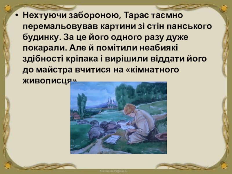 це його одного разу дуже покарали. Але й помітили неабиякі здібності кріпака і вирішили віддати його до майстра вчитися на «кімнатного живописця».