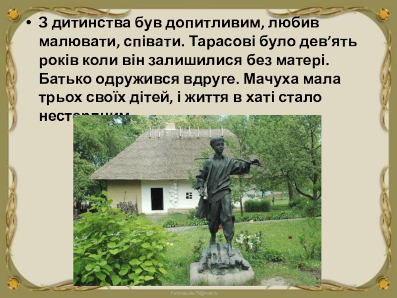 З дитинства був допитливим, любив малювати, співати. Тарасові було дев’ять років