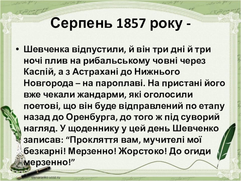 три ночі плив на рибальському човні через Каспій, а з Астрахані до Нижнього Новгорода – на пароплаві. На пристані його вже чекали жандарми, які оголосили поетові, що він буде відправлений по етапу назад до Оренбурга, до того ж під суворий нагляд. У щоденнику у цей день Шевченко записав: “Прокляття вам, мучителі мої безкарні! Мерзенно! Жорстоко! До огиди мерзенно!”