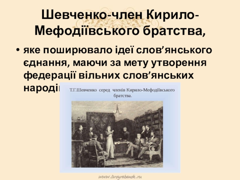 Слайд 30Шевченко-член Кирило-Мефодіївського братства,